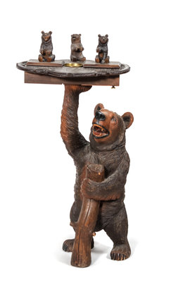the top featuring three carved bears, two opening to reaveal compartments and the pedestal carved to depict a standing bear, hinged at the neck opening to the humidor compartment