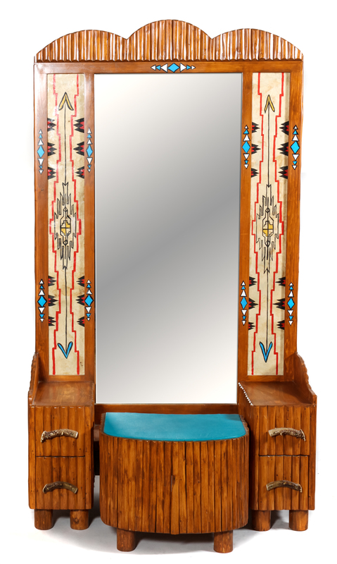 featuring hand painted Southwestern motif flanking the mirror, elk antler pulls and pole trim decoration surrounding the mirror; the bench having turquoise upholstery above pole trim sides