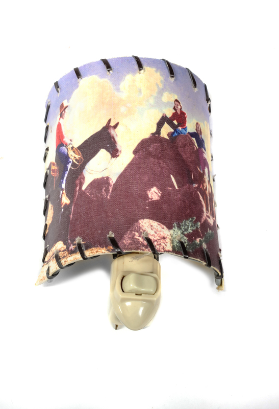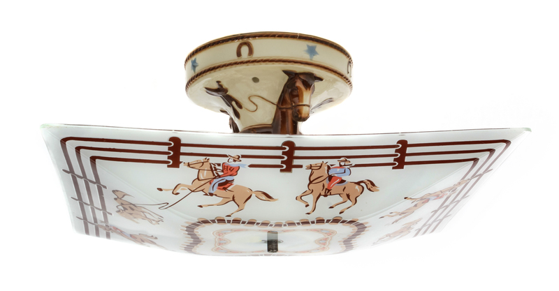 square glass fixture with ceramic mount depicting rodeo cowboys, together with cowboy motif night light