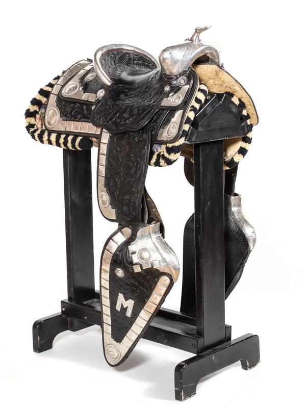with matching serape, bridle and bit together with a corona stamped Bohlin Made California Hollywood 4054 The saddle is unmarked but features leather tooling and silver engraving. With custom saddle stand