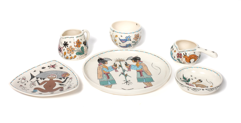 portraying a range of tribal traditions, legends, and designs, including ceremonial dancers, animals, plants, and abstract forms with an explanation of the symbols and traditions inscribed and dated on the bottom of each piece. A total of 27 pieces including; 8 plates, 8 handle bowls, 1 round platter, 1 triangular platter, 3 sauce pitchers, 1 large pitcher, 1 teapot, 1 covered roasting dish, and 3 bowls