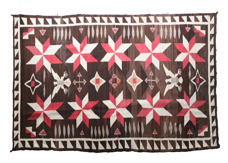 with red, natural white and light brown showing Valero stars, tadpoles, four-directionals, arrows, feathers, and eagles with outspread wings