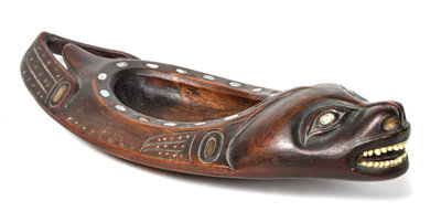 depicting a swimming otter in carved wood with shells, bone and abalone
