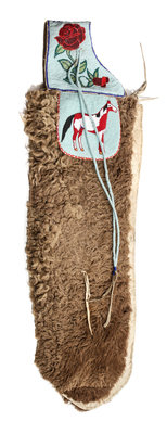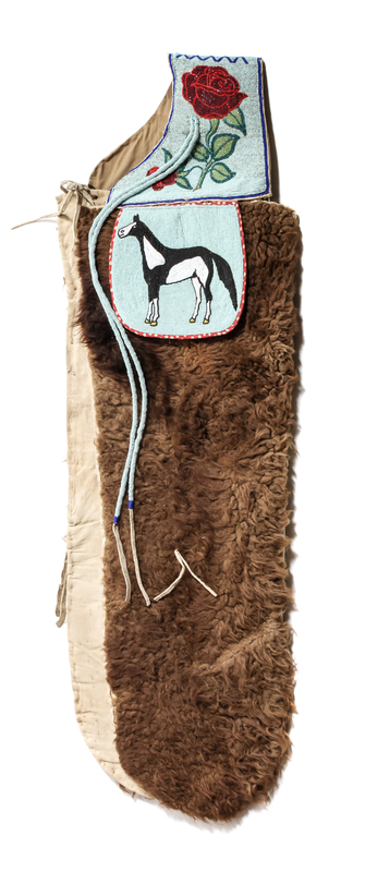 made to go behind a saddle, used in early parades. Buffalo hide, adorned at the top with a decorative flap on both sides, one showing a red and white paint horse, and the other a black and white paint horse. Edged with red and white calico cloth.