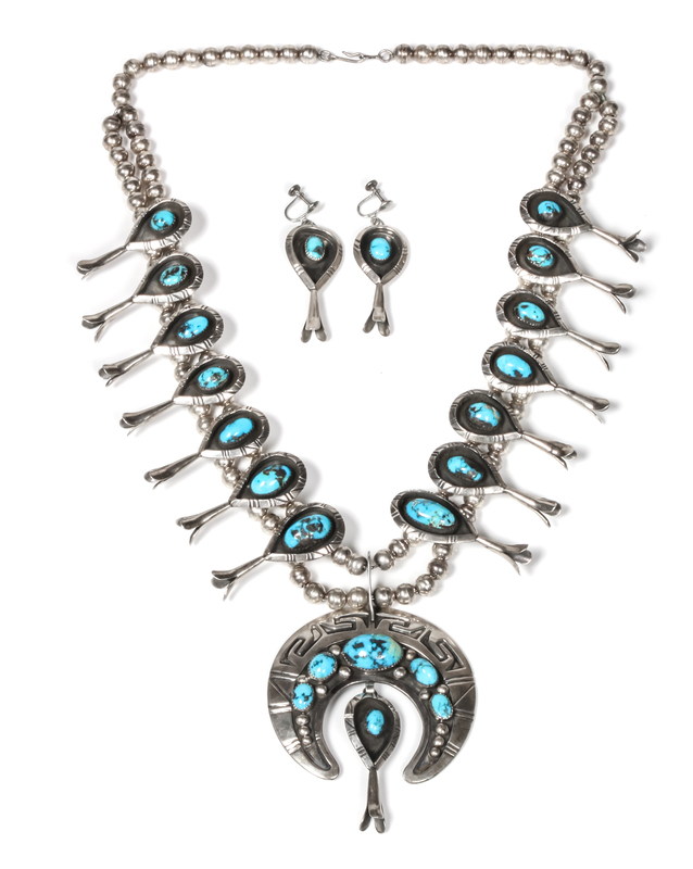Silver and Turquoise Squash Blossom Necklace and Earrings