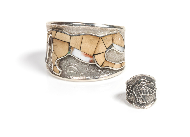 together with a silver tufa cast ring depicting a bird and flanked by flowers, both signed Monty Claw
