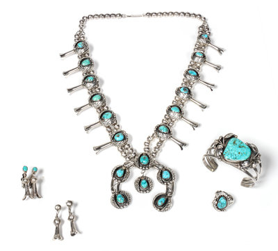 comprising a squash blossom necklace with coordinating bracelet, ring and two pairs of earrings