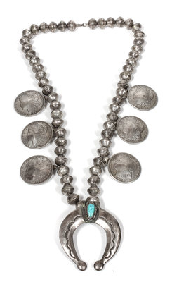 Southwestern Silver, Liberty Coin and Turquoise Squash Blossom Necklace