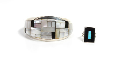 the cuff is a mosaic inlay with mother of pearl and jet, stamped KK, possibly for Keevin Kayana (Navajo), together with a silver, turquoise and jet ring by Harlan Coonsis (Zuni, b. 1958)