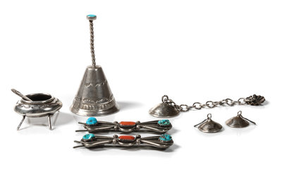 including turquoise and coral hair pins, a stamped silver bell with single turquoise stone and 1905 coin bell on chain with matching earrings and salt dish with spoon