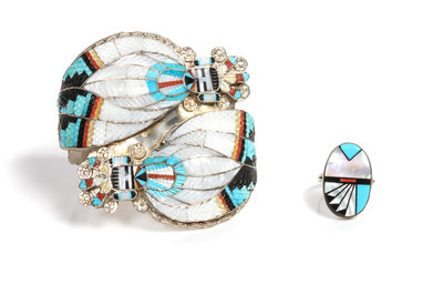 the bracelet depicting two corn maiden figures, together with a coordinating ring