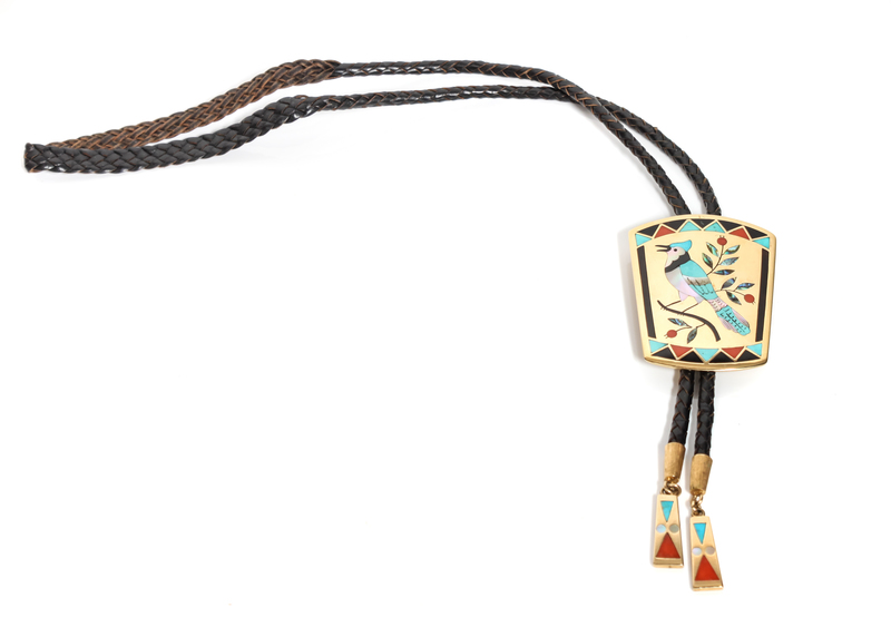 Zuni 18 Karat Yellow Gold Inlaid Bolo, Dennis Edaakie (b. 1931)