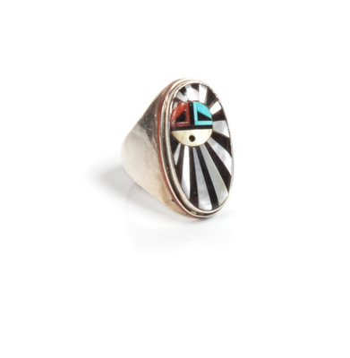 Zuni Silver Mosaic Inlay Sun Face Ring, Don C. Dewa