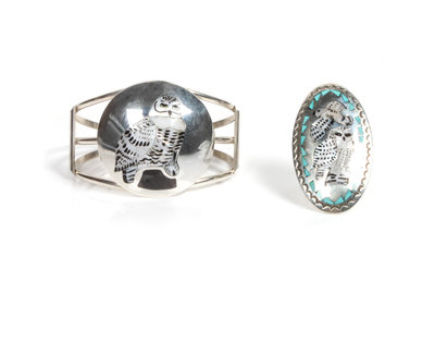 Zuni Silver and Multi-Stone Pictorial Cuff Bracelet and Ring, Quintin Quam