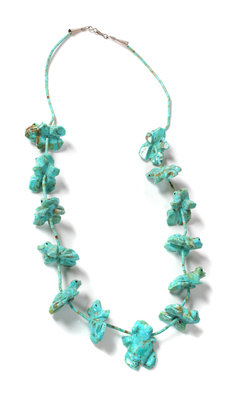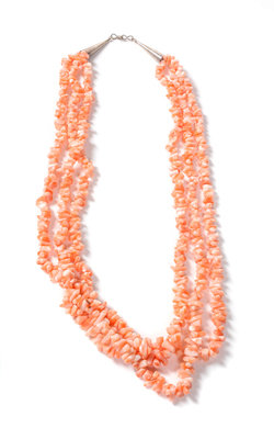 including a turquoise frog fetish necklace, a three strand coral necklace and a three strand necklace with square beads