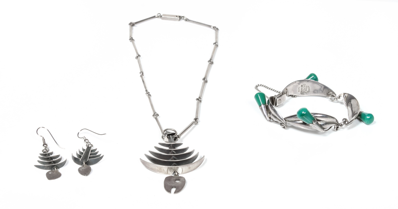 with fish motif, together with a Mexican silver and green stone bracelet