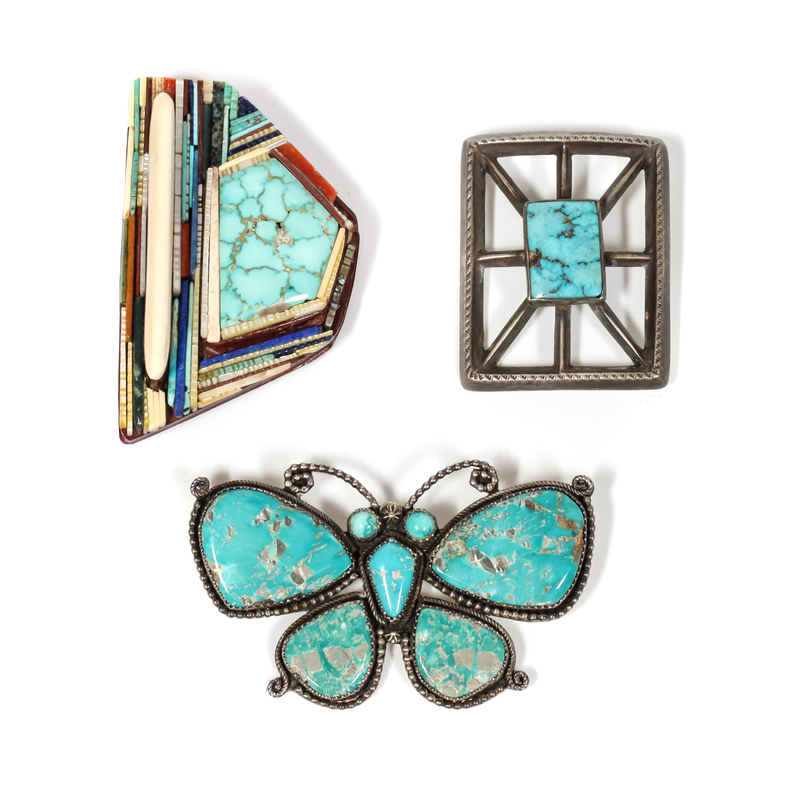 two silver and turquoise examples, one with multi-stone inlay on wood base