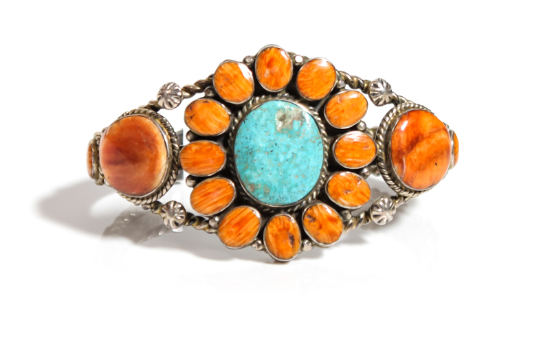 A Southwestern Silver, Turquoise and Spiney Oyster Cuff Bracelet