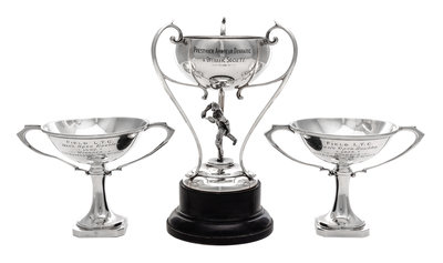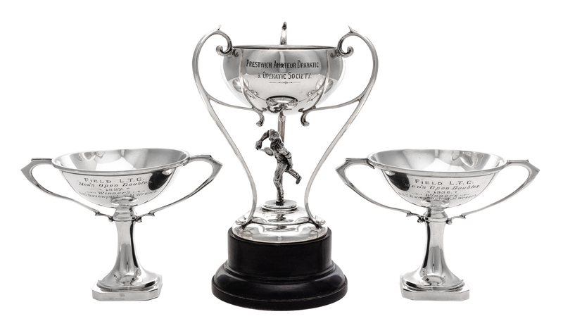 in the form of a tennis player supporting the bowl, raised on a wood base, together with two American silver tennis trophies of kylix form.