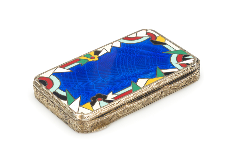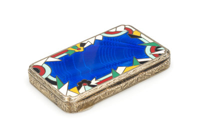 the lid having a blue guilloche enameled ground and a polychrome geometric border, the underside with an engine-turned ground.