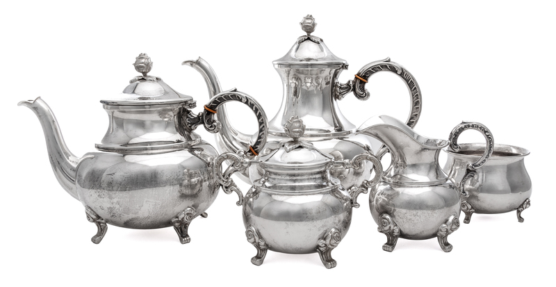 comprising a coffee pot, teapot, creamer, covered sugar and waste bowl, each having a baluster form body and raised legs headed by roses, the lidded items with blosson finials.
