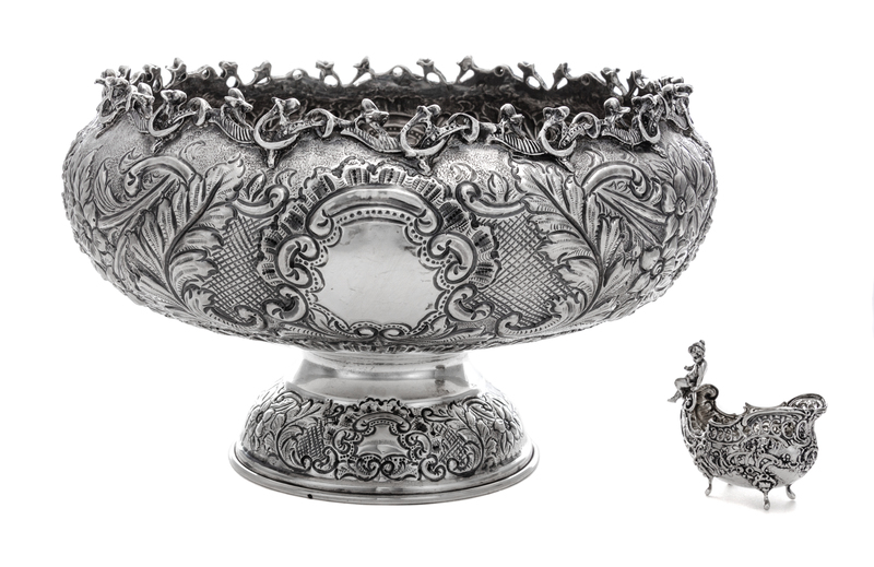 the body centered with C-scrolls enclosing a vacant cartouche among chased floral, foliate and lattice decoration, raised on a similarly worked circular foot, together with a Continental silver salt.