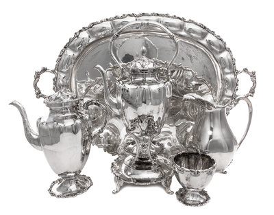 comprising a water kettle on stand, coffee pot, milk jug, sugar and a handled tray, each having a foliate decorated rim and a baluster form body, together with a similarly decorated center bowl.