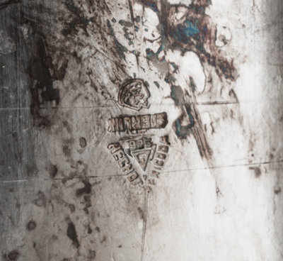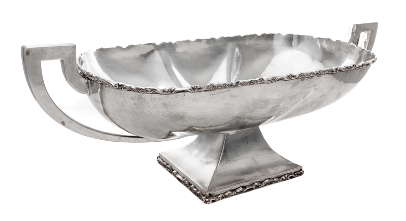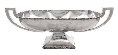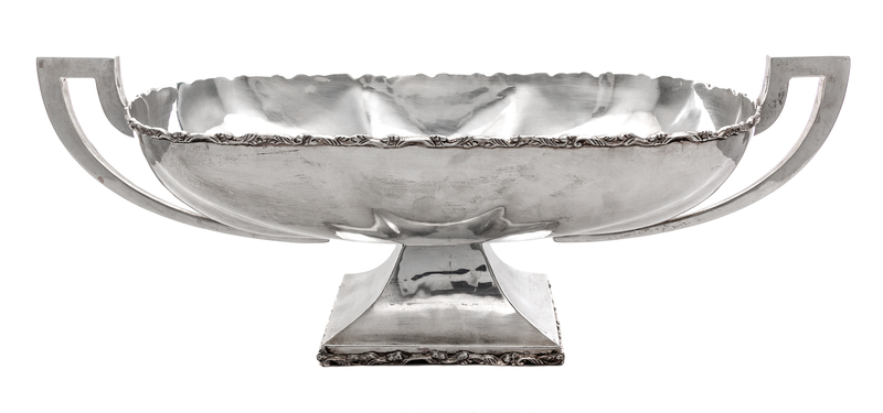 the twin-handled body of elongated oval form, raised on a tapering square foot.