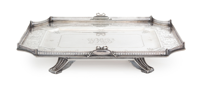 of rectangular form with concave corners, the pierced gallery enclosing a field centered with an engraved script monogram within a border engraved to show flowers and foliate scrolls.