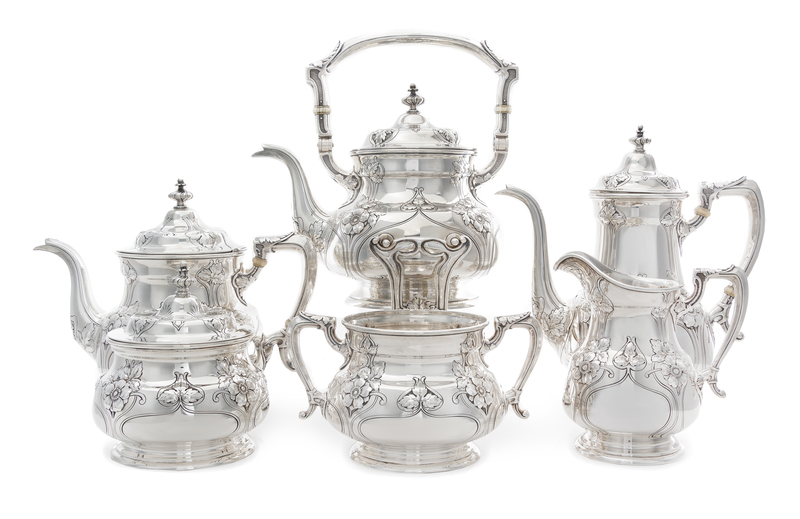 comprising a water kettle on stand, coffee pot, teapot, creamer, covered sugar and waste bowl, each body worked to show floral and foliate elements in the Art Nouveau taste and with the engraved script monogram MAB.