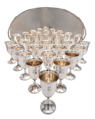 each having an engraved script monogram E and raised on a circular foot, together with an associated silver-plate serving tray.