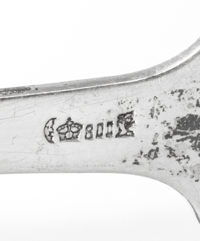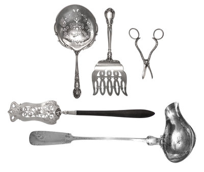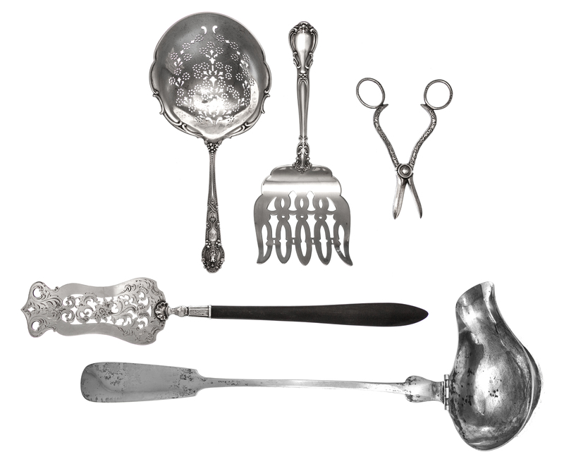 comprising an asparagus server, Gorham Mfg. Co.; a tomato server, Tiffany & Co.; a German .800 silver punch ladle with a fiddle-form handle, H. Meyen & Co., Berlin and a German 13 lot fish server with a wood handle, together with a silver-plate grape shears.