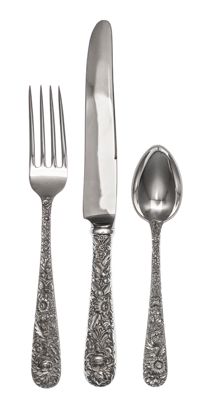 Repousse pattern, comprising:18 dinner knives18 dinner forks18 salad forks12 cocktail forks36 teaspoons18 soup spoons5 table spoons12 butter spreaders2 cake servers1 berry spoon 1 salad serving spoon1 cream ladle1 sauce ladle1 condiment spoon1 sugar scoop1 bon bon server1 cold meat fork1 sugar tongs1 baby spoon1 lemon fork1 olive fork1 master butter knife1 angel food cake server1 cheese slice1 two-piece carving set1 Hand Decorated creamer1 Hand Decorated sugar