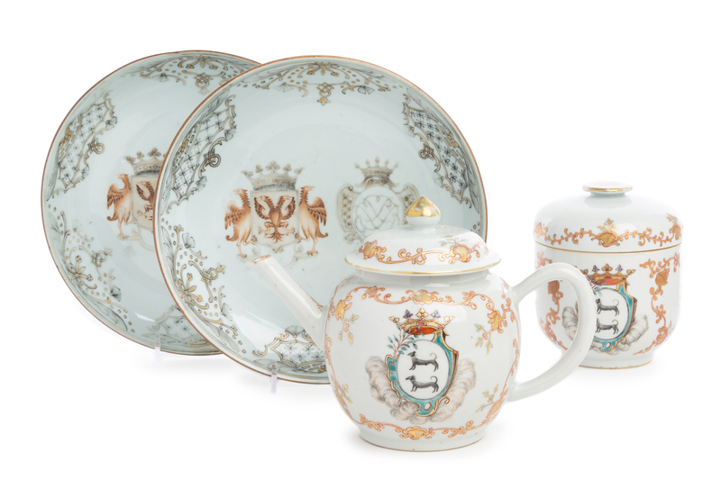 A Pair of Chinese Export Armorial Dishes, a Teapot and Sugar Basin