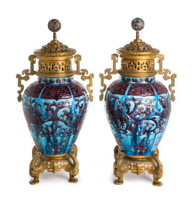 A Pair of Chinese Gilt Bronze Mounted Porcelain Fahua Vases