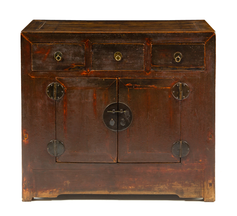 the rectangular top above the case fitted with three aligned drawers with ring pulls and two cabinet doors with a circular lockplate opening to a shelved interior.