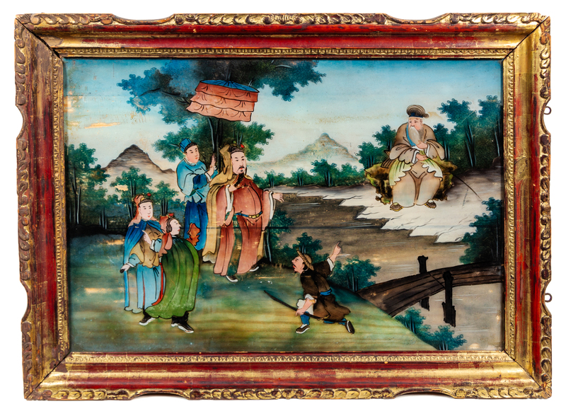 of rectangular form, painted to depict an official facing a seated elderly man among attendants in an outdoor setting, set in a giltwood frame.