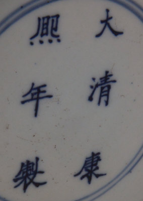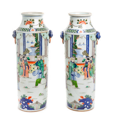each of tapering cylindrical form with applied mask ring handles, decorated with a continuous band of figures in a landscape, with a six-character and double-ring mark to the underside.