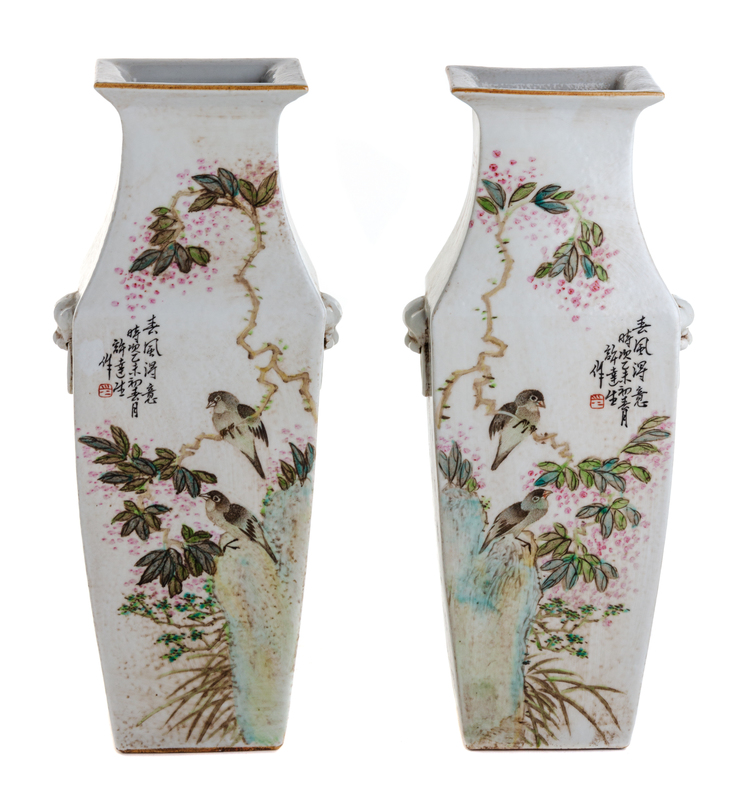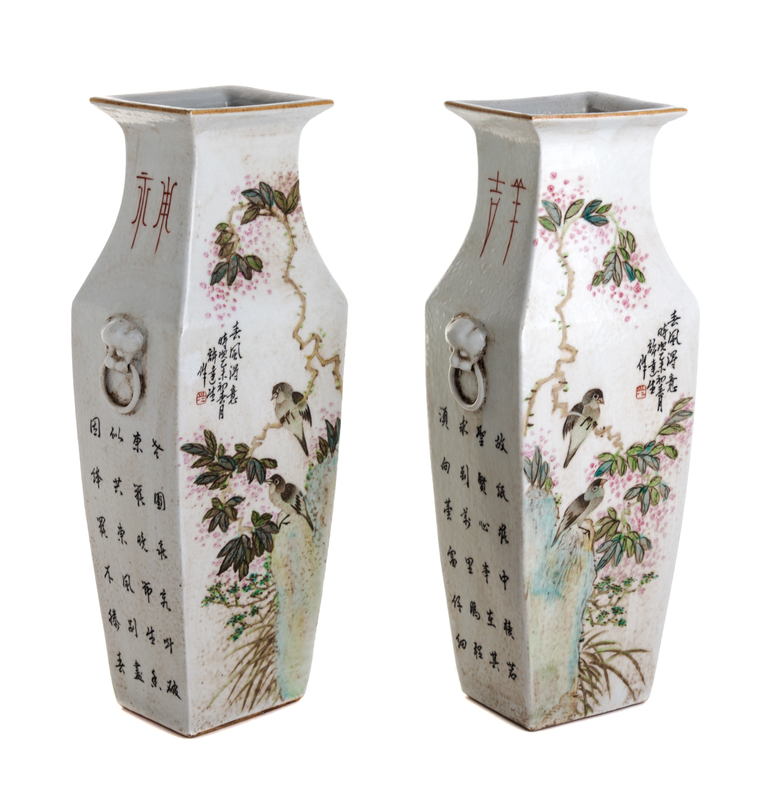 each of squared baluster form with applied mask ring handles, decorated to show birds in landscapes and various texts.