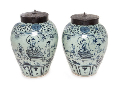 each of ovoid form, decorated to show figures playing go, with iron lids and locks.