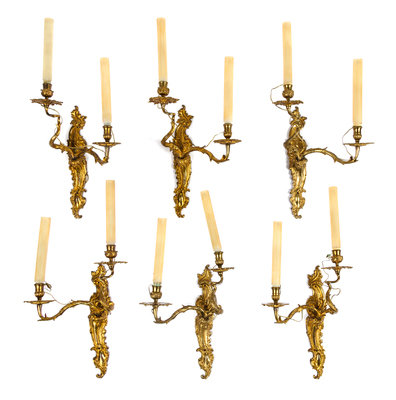 A Set of Six Louis XV Style Gilt Bronze Two-Light Sconces