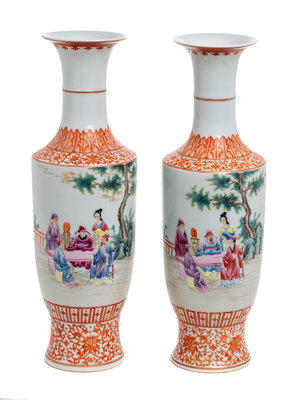 each of baluster form, having a continous band of figures in a landscape within orange foliate borders, with a six-character mark to the underside.