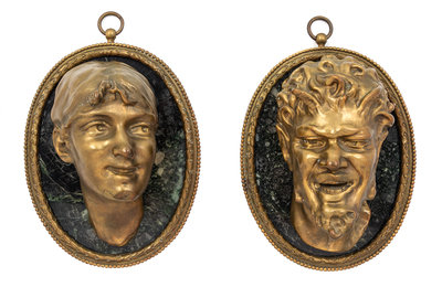cast to show the bust of a lady and a satyr, each mounted to an oval marble plaque, signed Clodion.