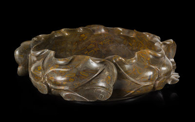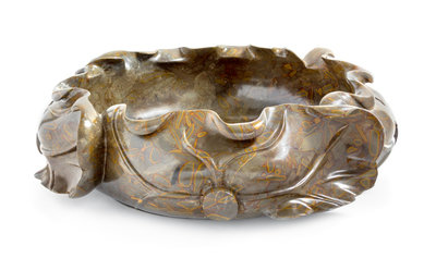 in the form of a large scrolling lotus leaf, carved to the exterior in high relief with leafy vines.