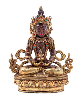 depicted in a seated pose, raised on a lotus base.