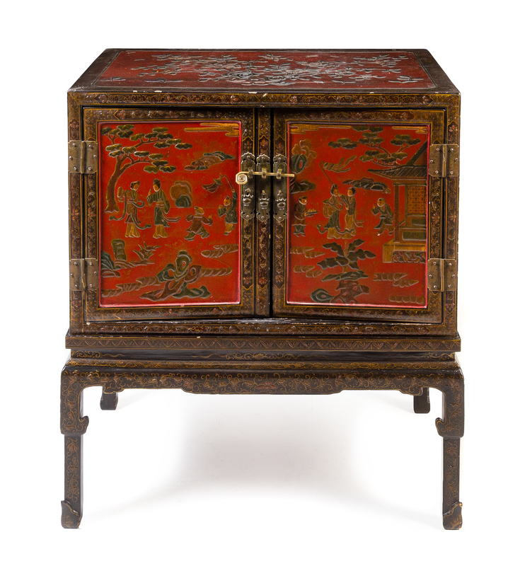 the case fitted with two doors and mounted with bail handles at the sides, worked to show figures engaged in various pursuits in outdoor settings among flowering branches, raised on a conforming stand with straight legs.