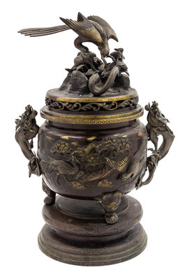 the body with two writhing dragon form handles, the cover cast to show a bird of prey and a serpent, raised on a shaped circular base.