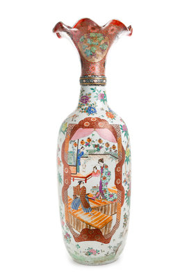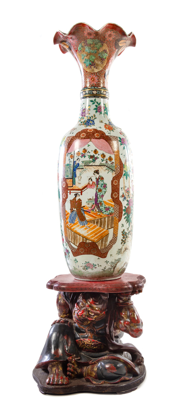 of bottle form with flared ruffle rim, having figural, floral and inset decoration, with a six-character mark to the underside and raised on an associated lacquered figural stand.
