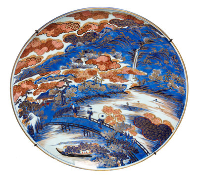 decorated to show figures crossing a bridge in a river landscape, with a four-character mark to the underside.