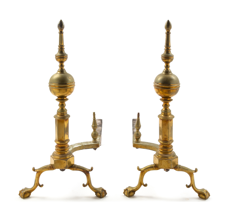 A Pair of Brass Steeple Top Andirons